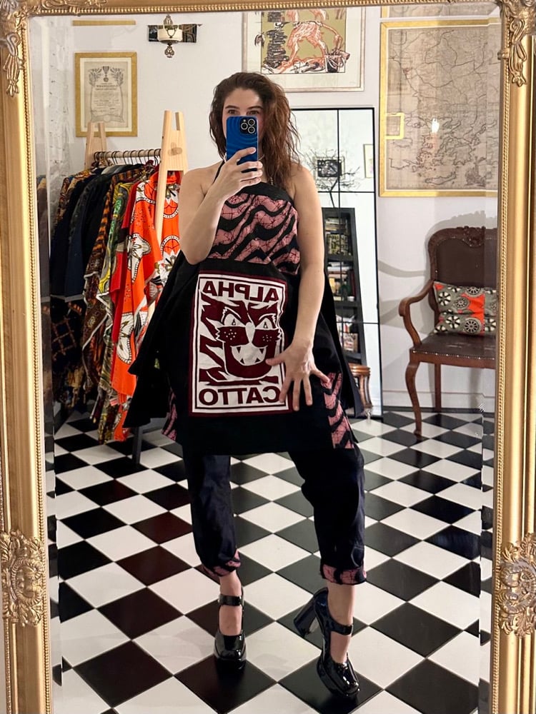 One side: a pink heartbeat, printed in African wax on black ripstop.